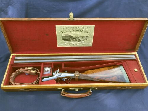 A very beautiful back action hammergun by John Dickson & Son. It sports lovely 30 x 2 ½ nitro reproof damascus barrels, a fabulous original stock and is presented in a oak lined hammergun case.