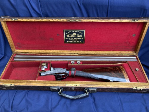 Firstly, we have a very nice damascus barrelled, sidelock ejector by the famous W P Jones of Birmingham. With its 30 x 2 ½ nitro reproof barrel and highly figured stock, it is a very nice gun at a sensible price. Notably, it has not only a pair of replacement strikers in their dedicated pot but also a pair of spare mainsprings and spare ejector springs.