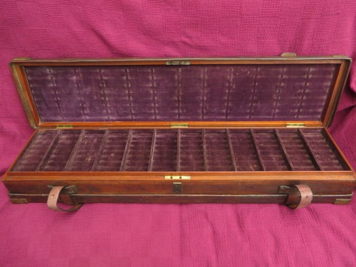 271416 Very rare double sided mahogany and leather gun case, possibly built for Live Pigeon shooting: blocked for a single hammerless gun with 30” barrels and 17 ¼” breech to heel. Opposite side takes up to 96 x 12b cartridges. Lined in purple velvet with new handle and captive straps. This case is of the highest quality and is a must for someone with the appropriate gun to go inside!