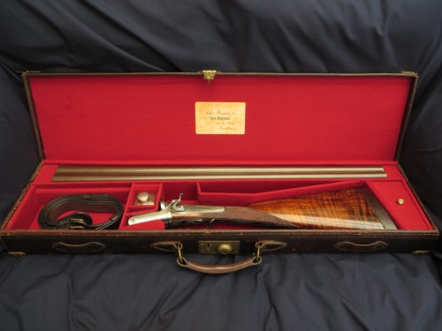 1887 J Rigby & Co 12b Underlever SLE 30” x 2 ½” nitro damascus barrels, highly figured replacement wood, oak & leather case.
