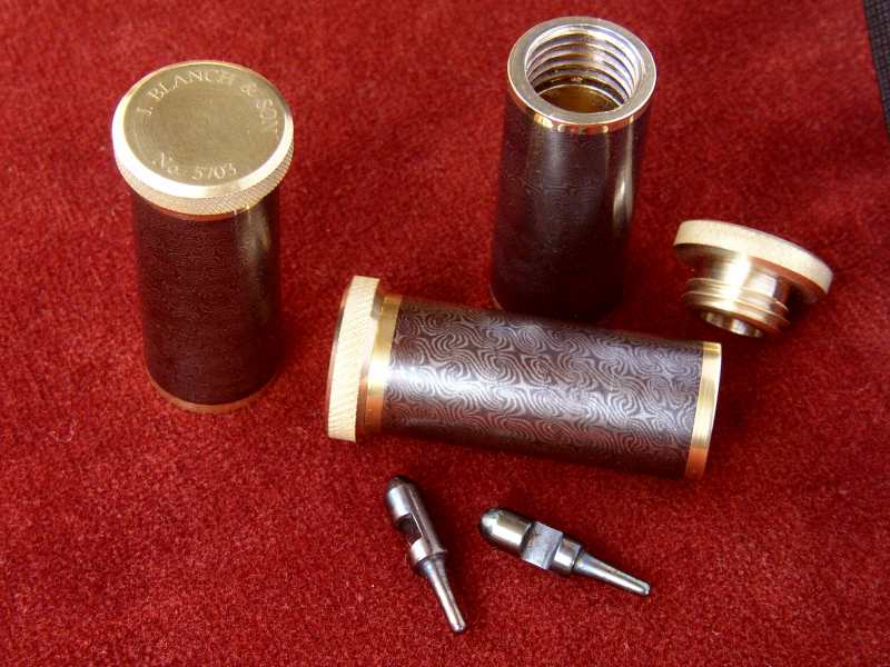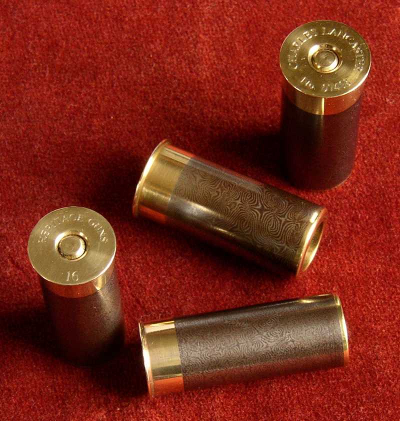 Our Damascus and Brass snap caps, oil bottles and striker pots are made and browned in-house from the scrap Damascus tubes of sleeved guns that have passed through our workshops. These are carefully turned to fit the brass bodies and then finely polished and browned alongside our complete Damascus barrel sets.